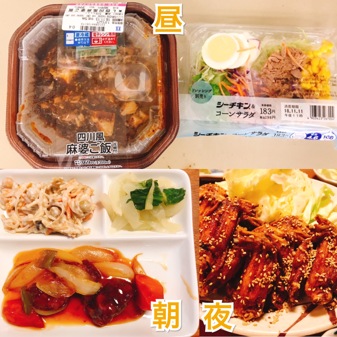 朝は「わんまいる」の調理時間10分のヘルシー食事、酢豚です。櫃はファミマセット、麻婆豆腐とサラダです。リ夜は居酒屋で、手羽先と付属のサラダを精一杯食べました!