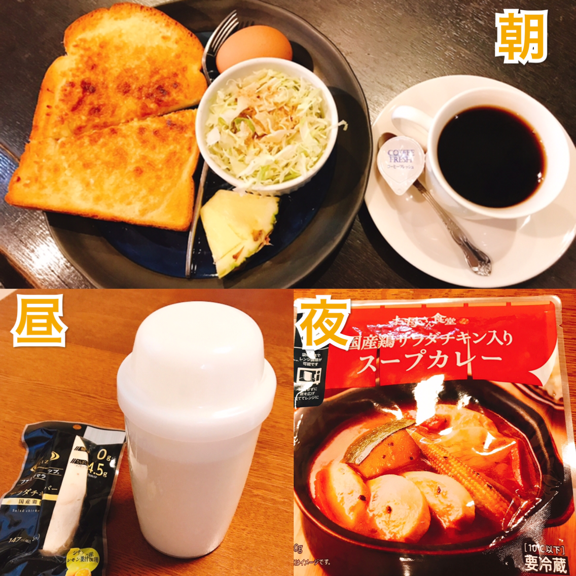 朝は喫茶店のモーニング、アーモンドトーストです。昼はスムージーとライザップチキンバー。夜はファミマの密かに人気である「お母さん食堂」。噂通り、調理簡単で美味しかったです。
