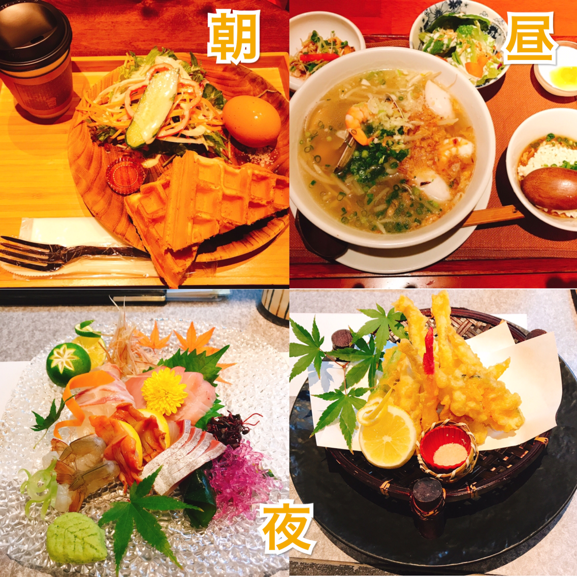 朝はサラダとワッフル。昼は外食ランチのフォーを中心としたランチ。夜はワカサギのてんぷら、刺身です。