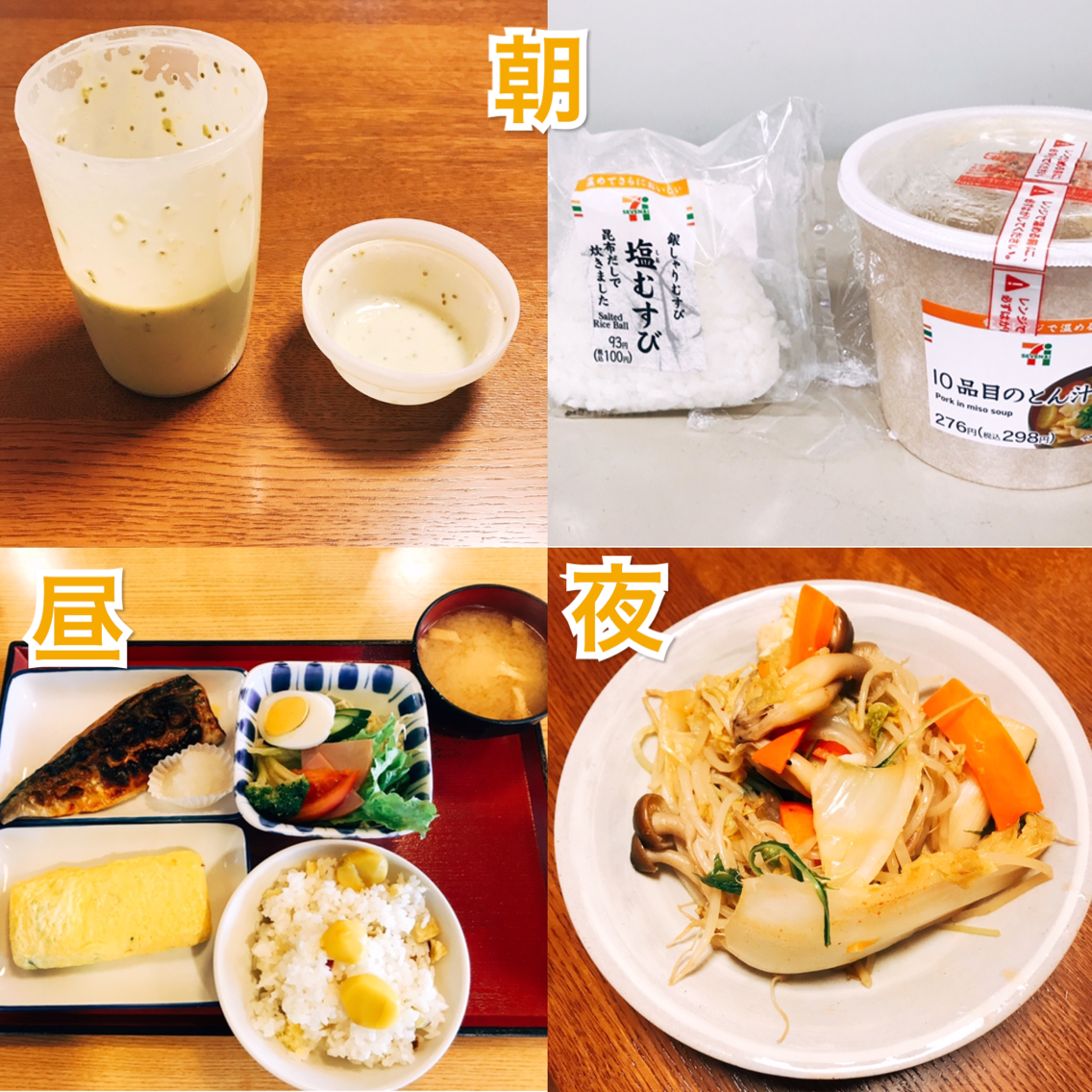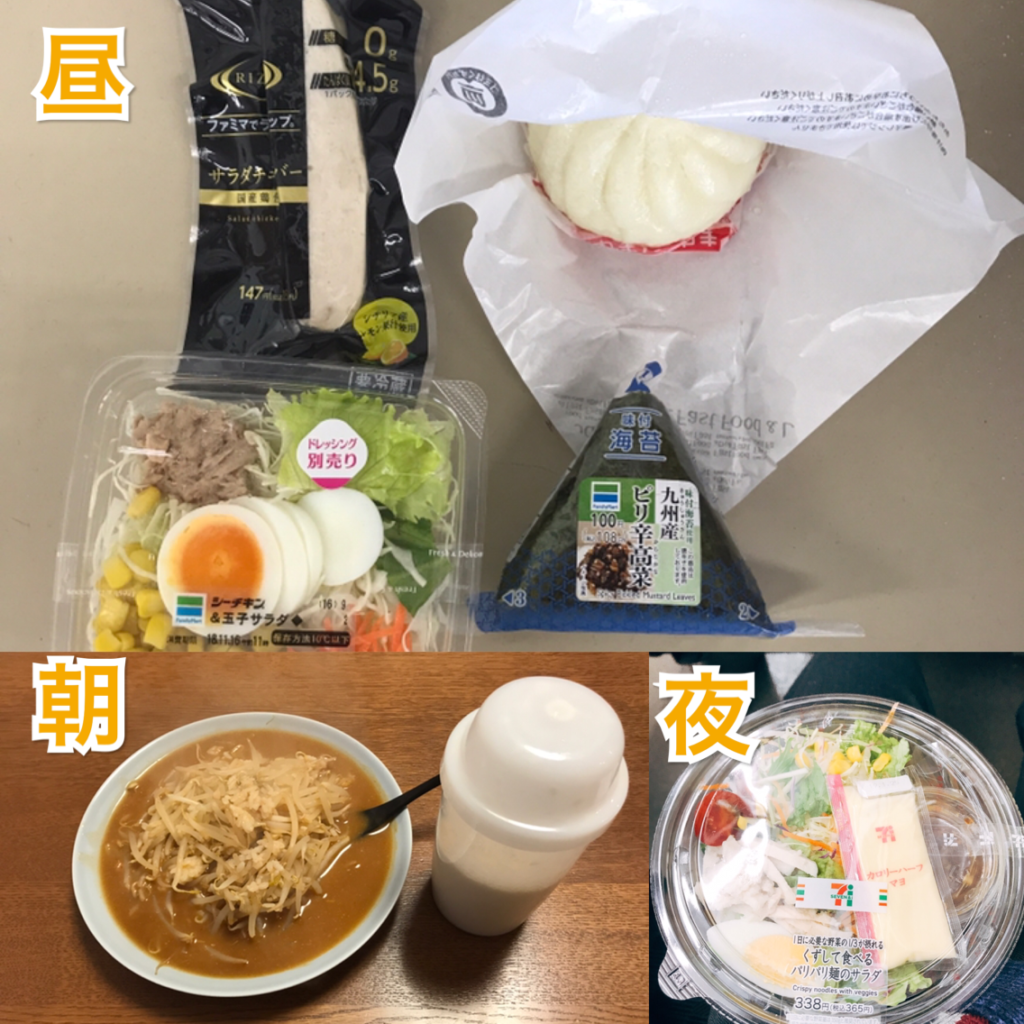 朝はキムチ鍋の残りで、もやし多めの雑炊。昼はコンビニランチで、サラダ・肉まん・おにぎり1個・チキンバー。夜はサラダのみ。