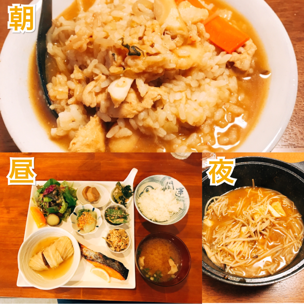 朝はキムチ鍋の雑炊。昼は定食。夜はキムチ鍋でもやし多め。