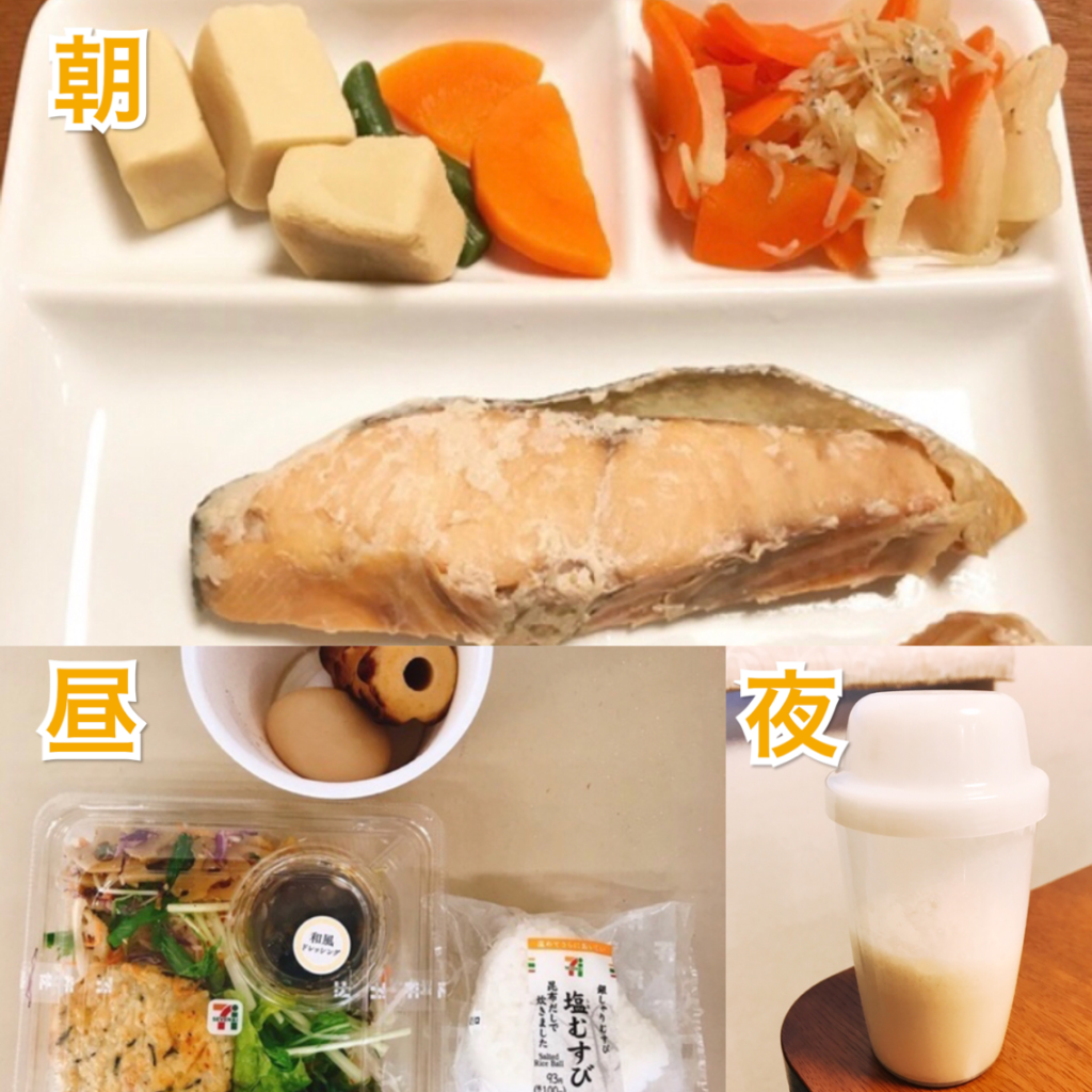 朝はわんまいるの鮭。昼はコンビニ食。夜はスムージー。